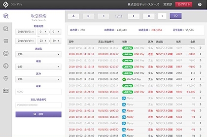 WeChat pay・Alipay・LINE Payなどを一つ管理画面に集約し、加盟店のバックヤード業務を効率化させる仕様にしています。